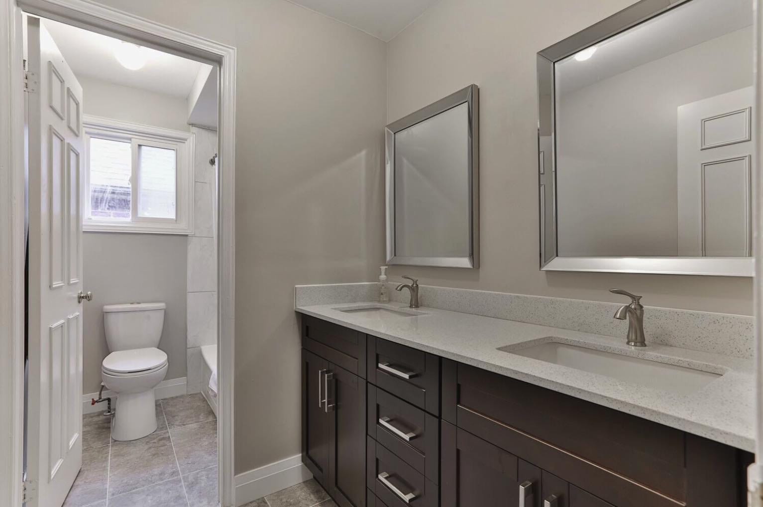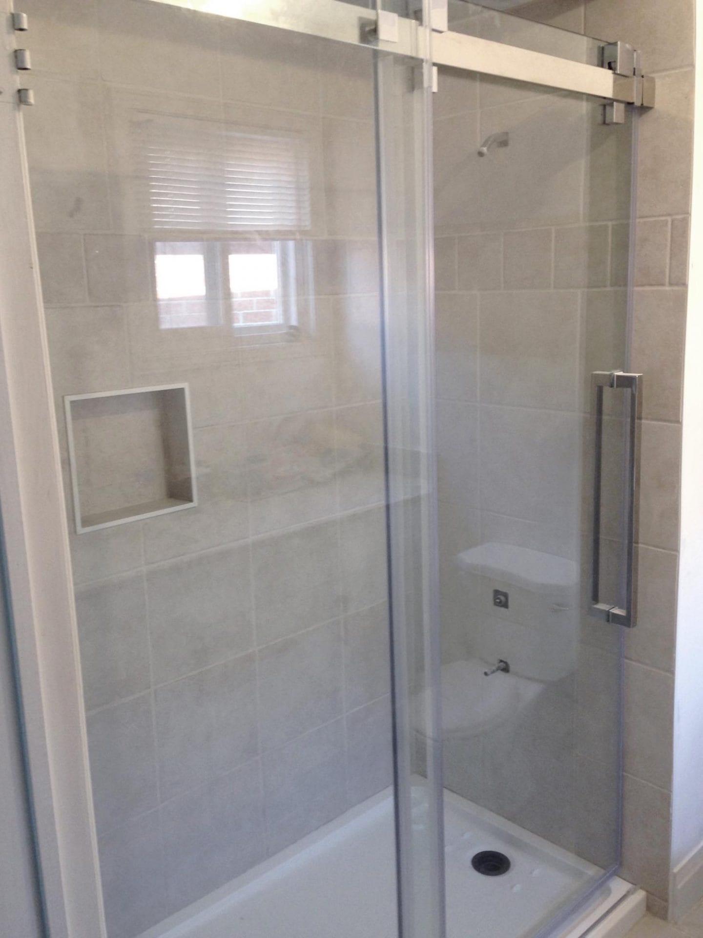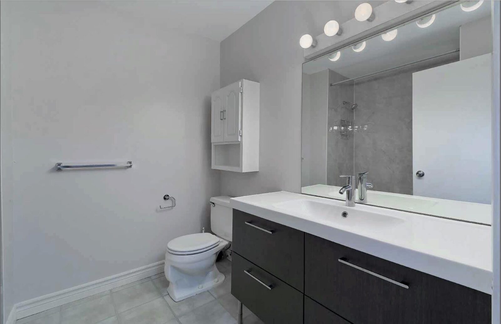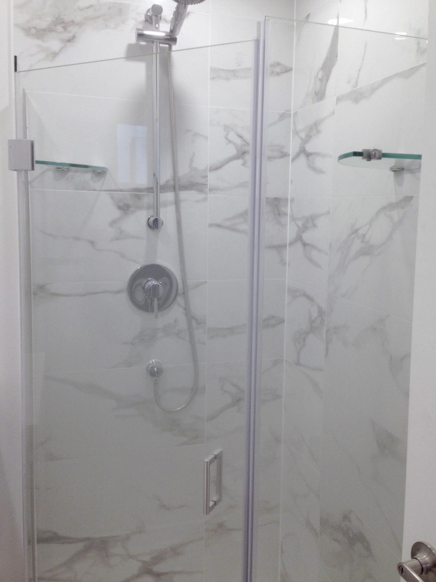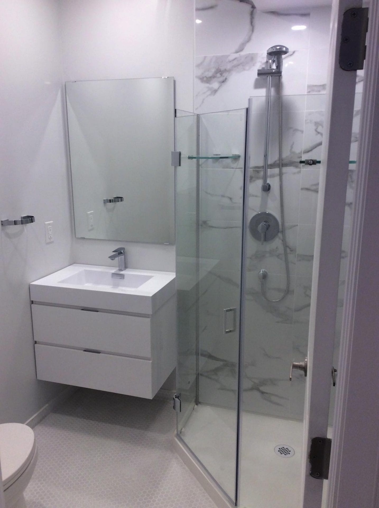 Brand new basement bathroom build, new plumbing, recessed lighting, wall mounted vanity, new glass shower enclosure, adjustable shower handle control arm, dual flush toilet, ceramic white penny tile, porcelain Carrera Marble wall tile, and hardware