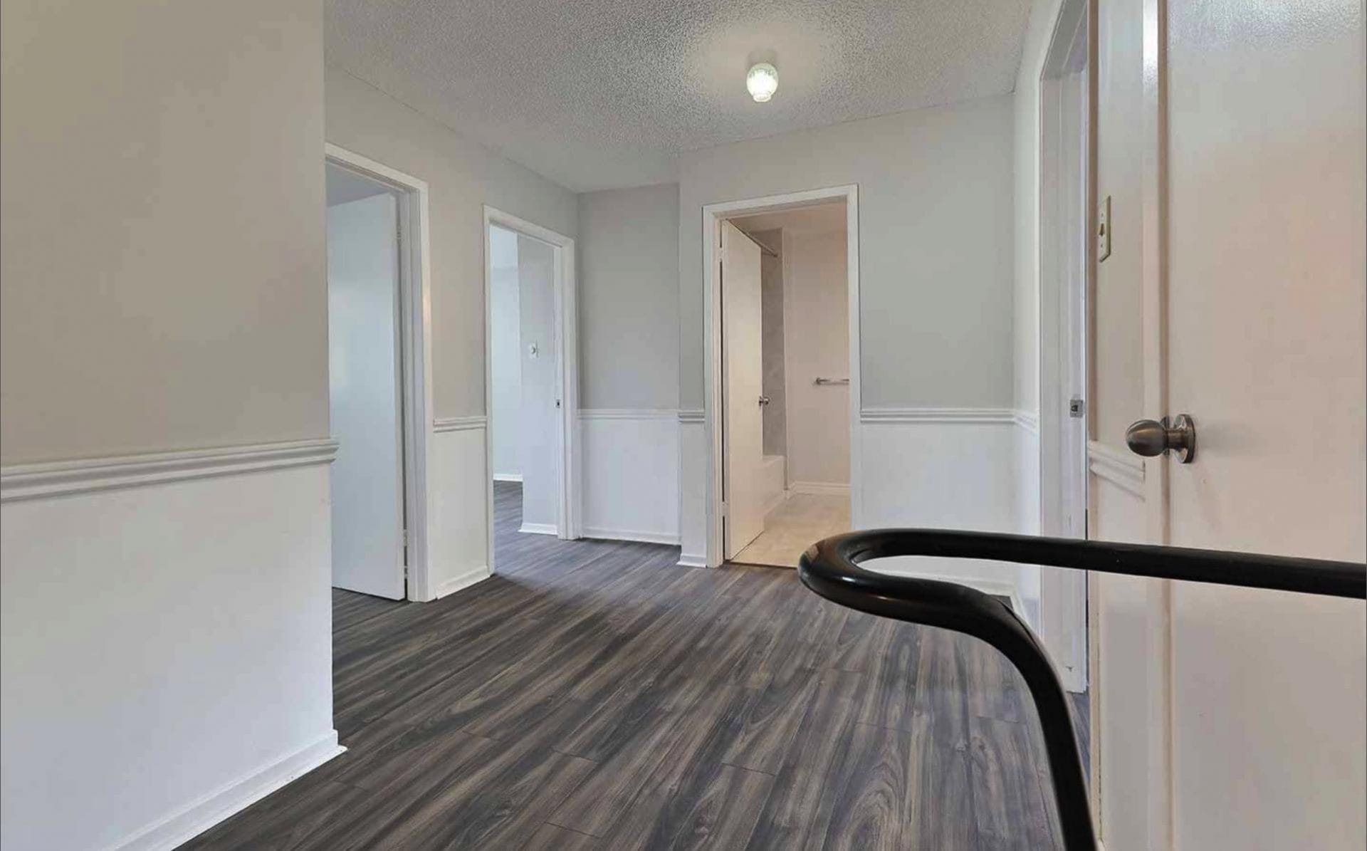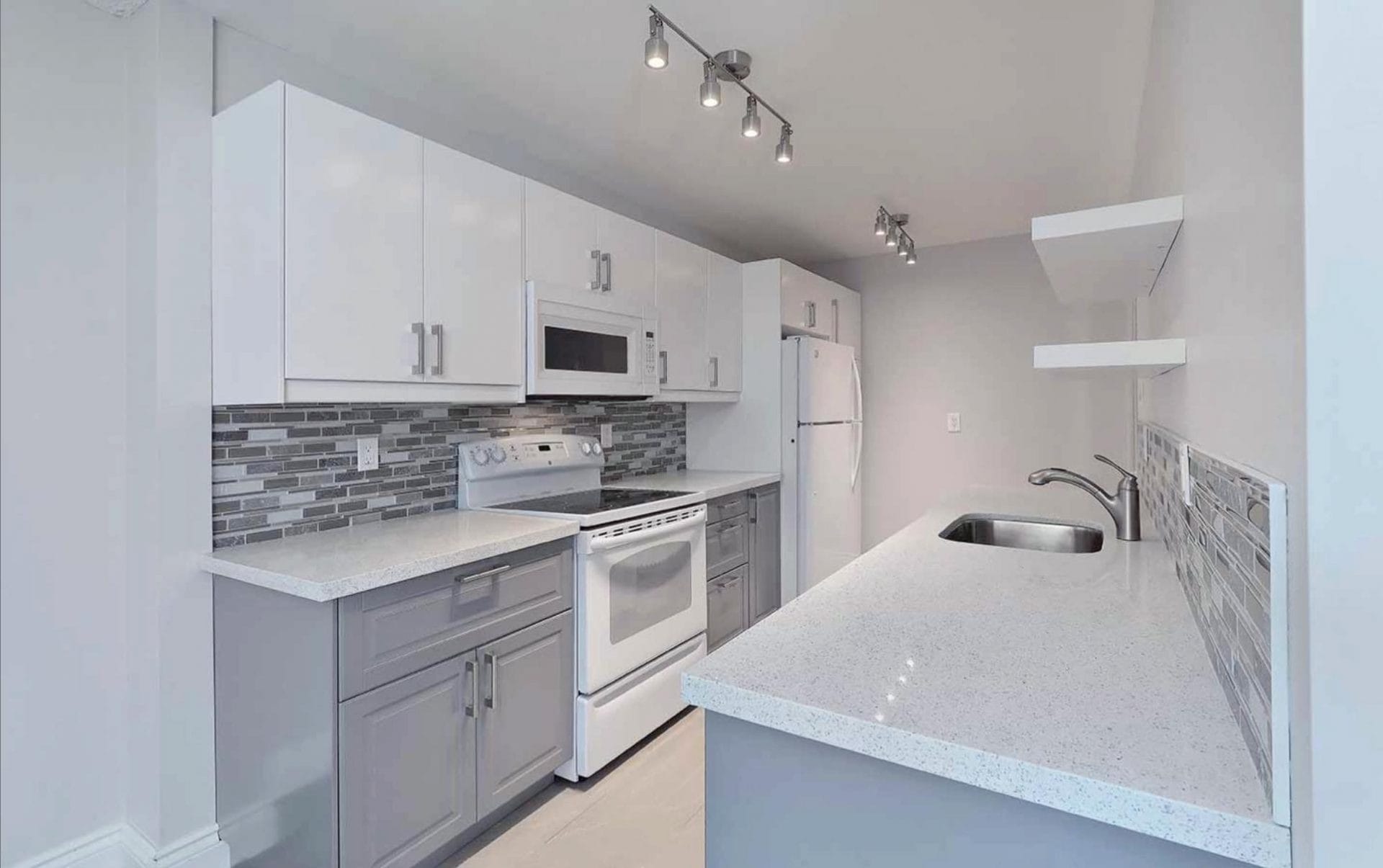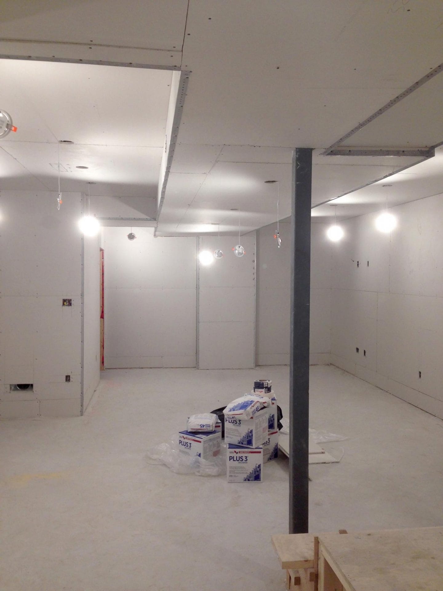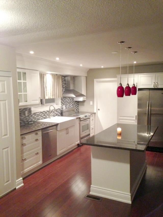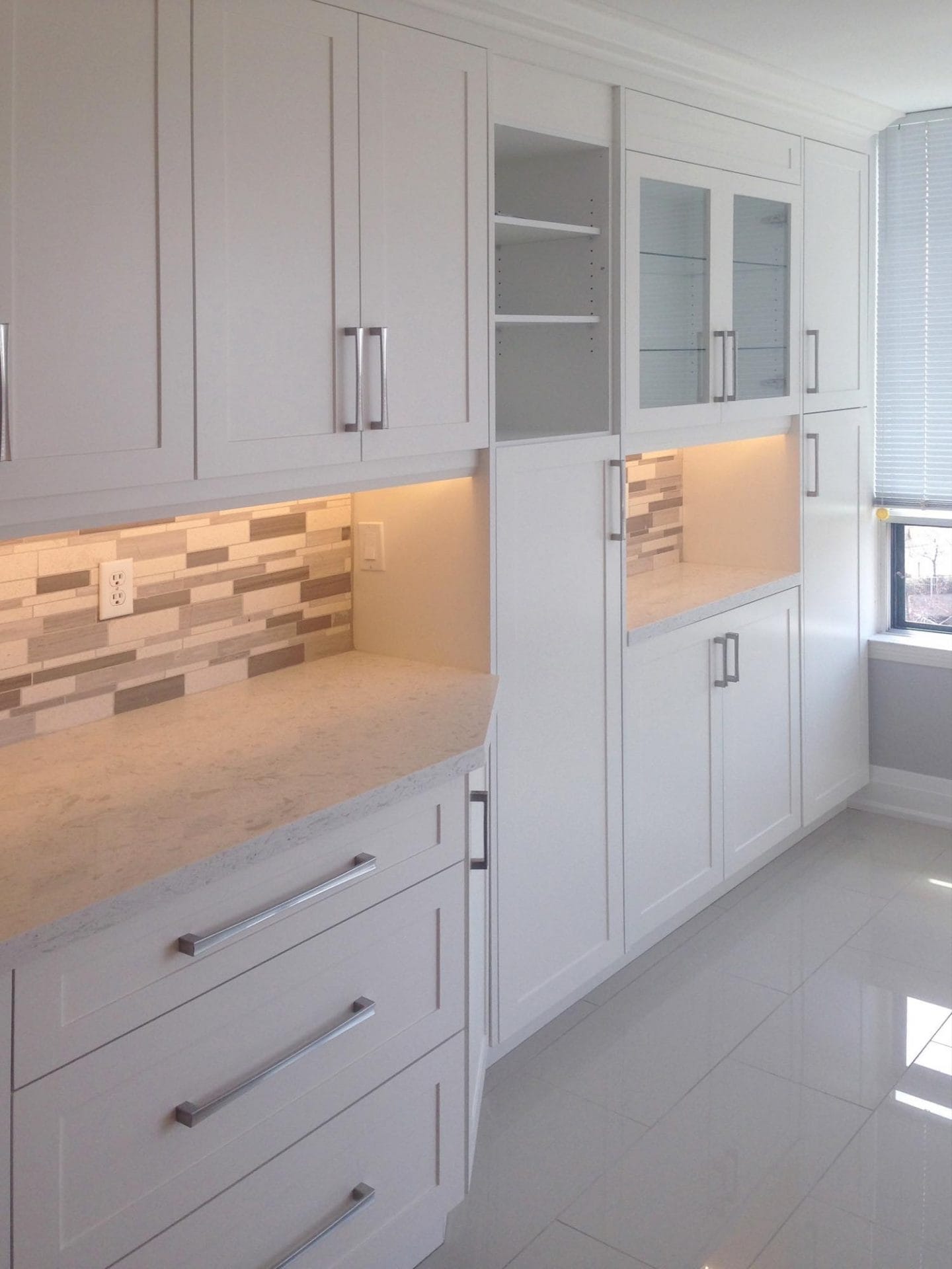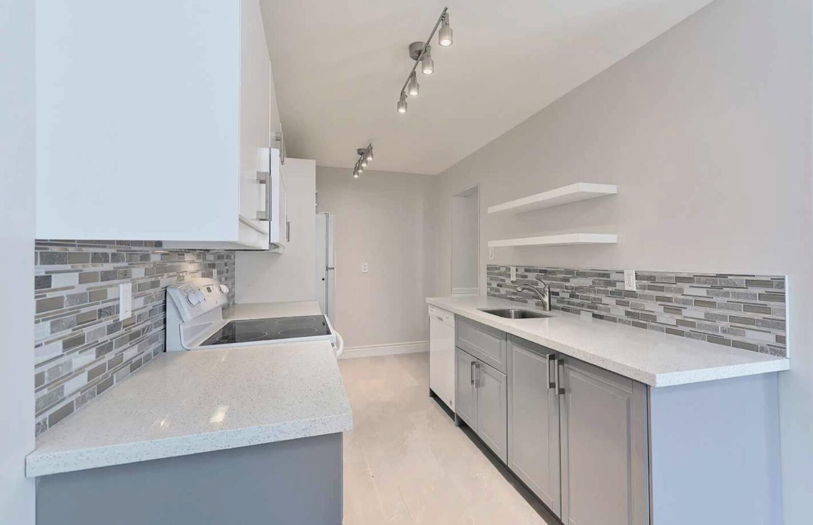 Brand new basement bathroom build, new plumbing, recessed lighting, wall mounted vanity, new glass shower enclosure, adjustable shower handle control arm, dual flush toilet, ceramic white penny tile, porcelain Carrera Marble wall tile, and hardware