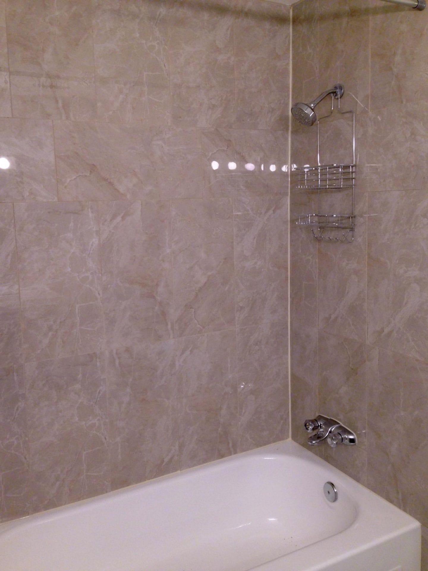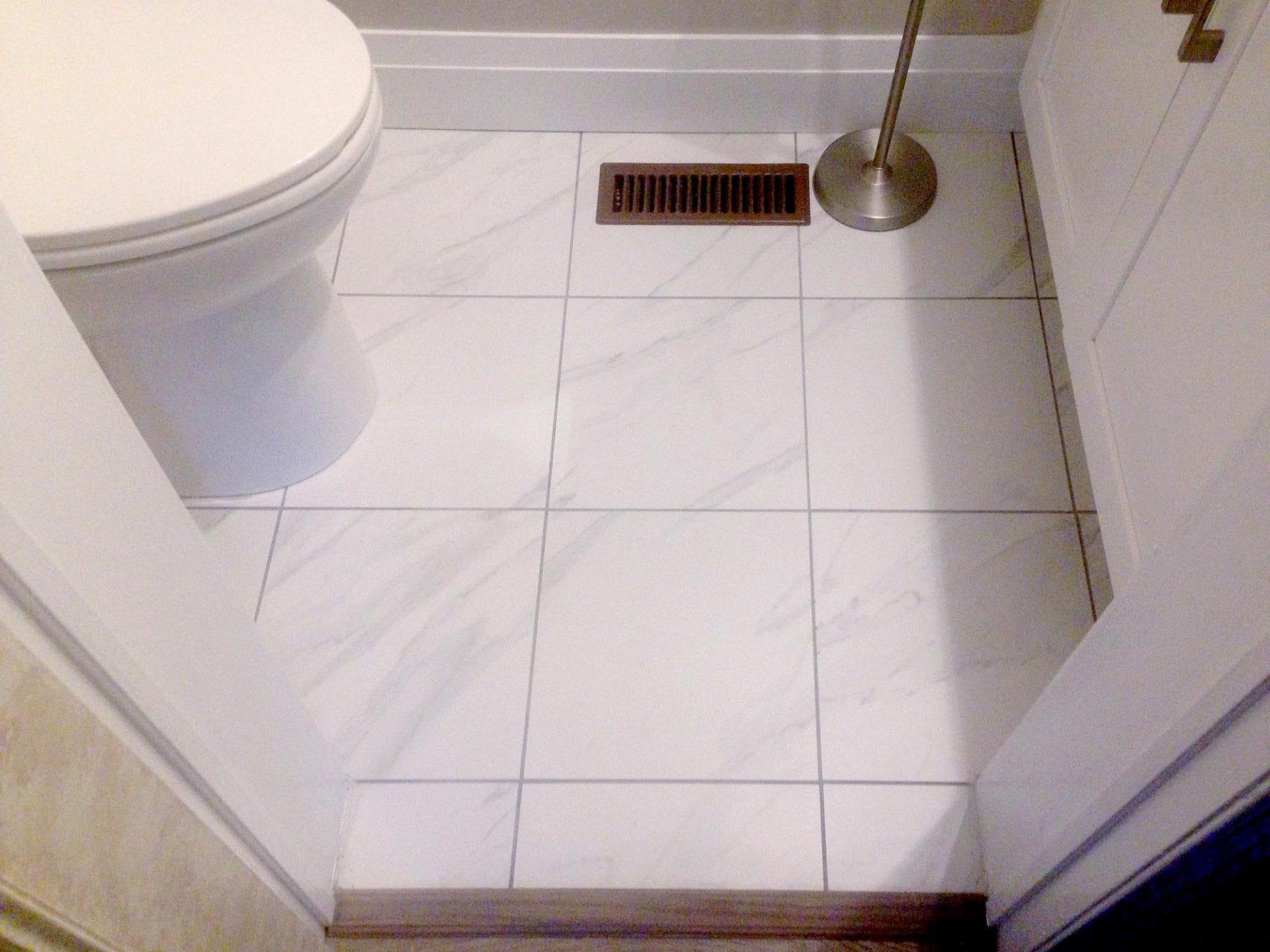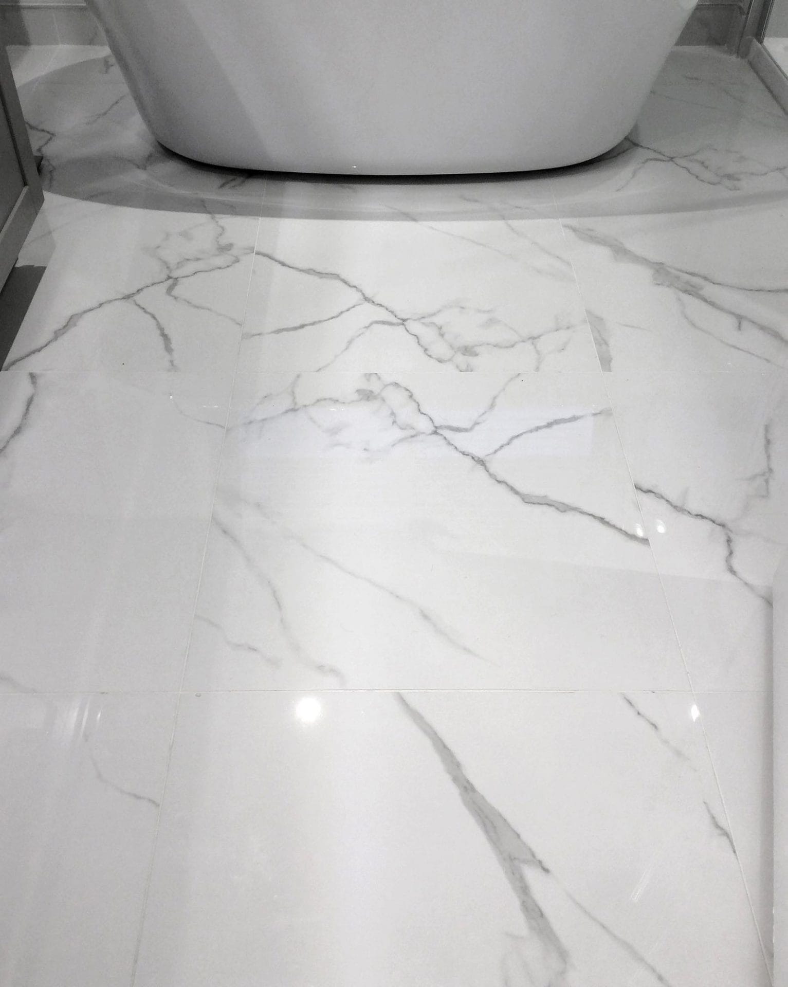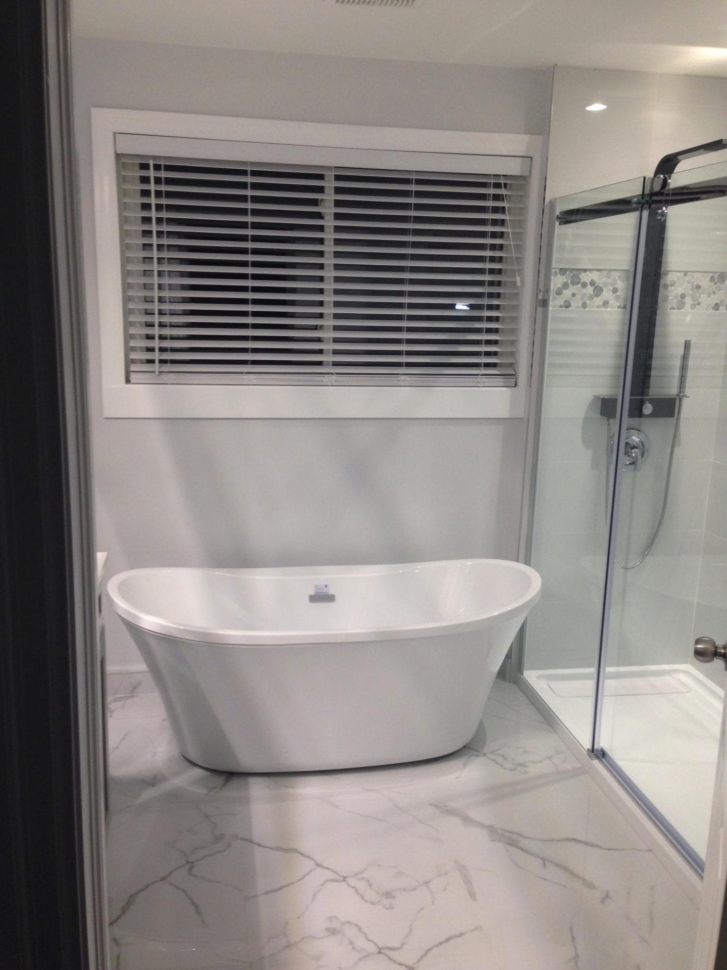 Full bedroom to master bath conversion , new drainage/venting and water supply lines, 24″ x 24″ porcelain Carrera marble tile, Bright white flat white porcelain wall tile with pebble stone accent strip, new dual flush toilet, solid wood 60″ double vanity with quarz countertop and single arm faucets, 60″ soaker tub and hardware