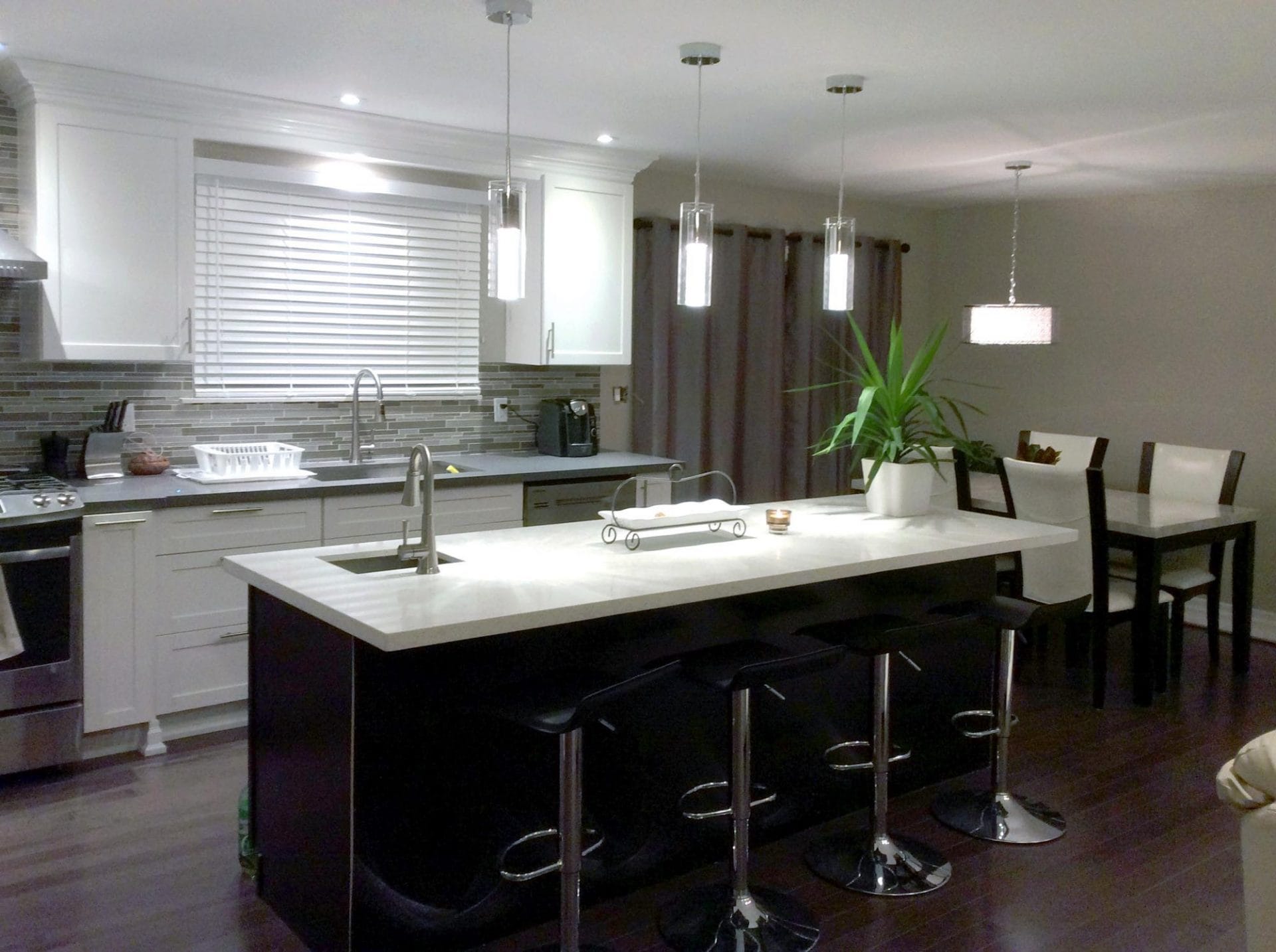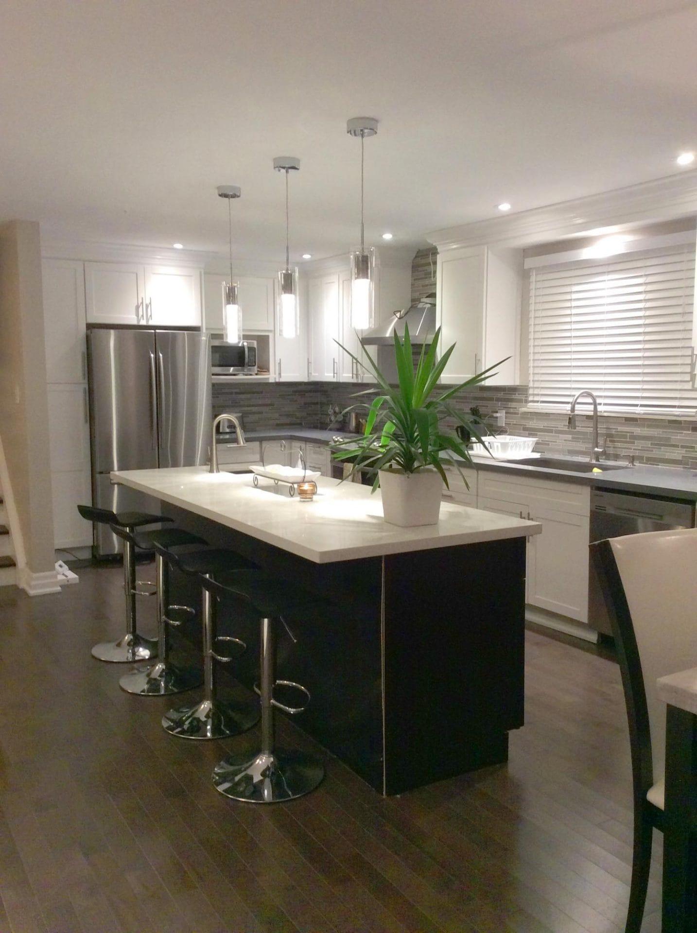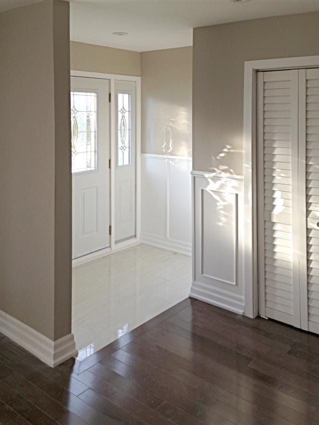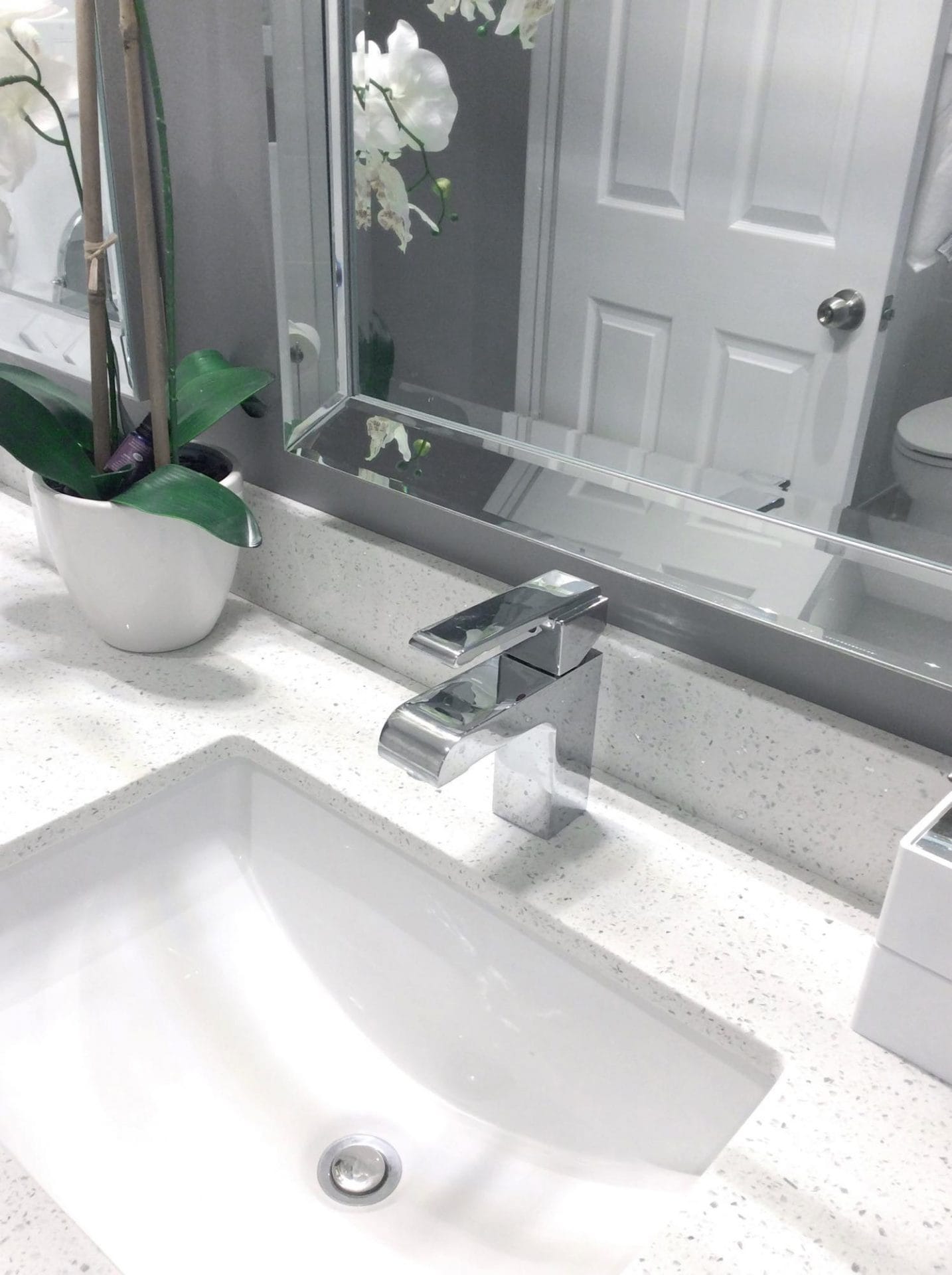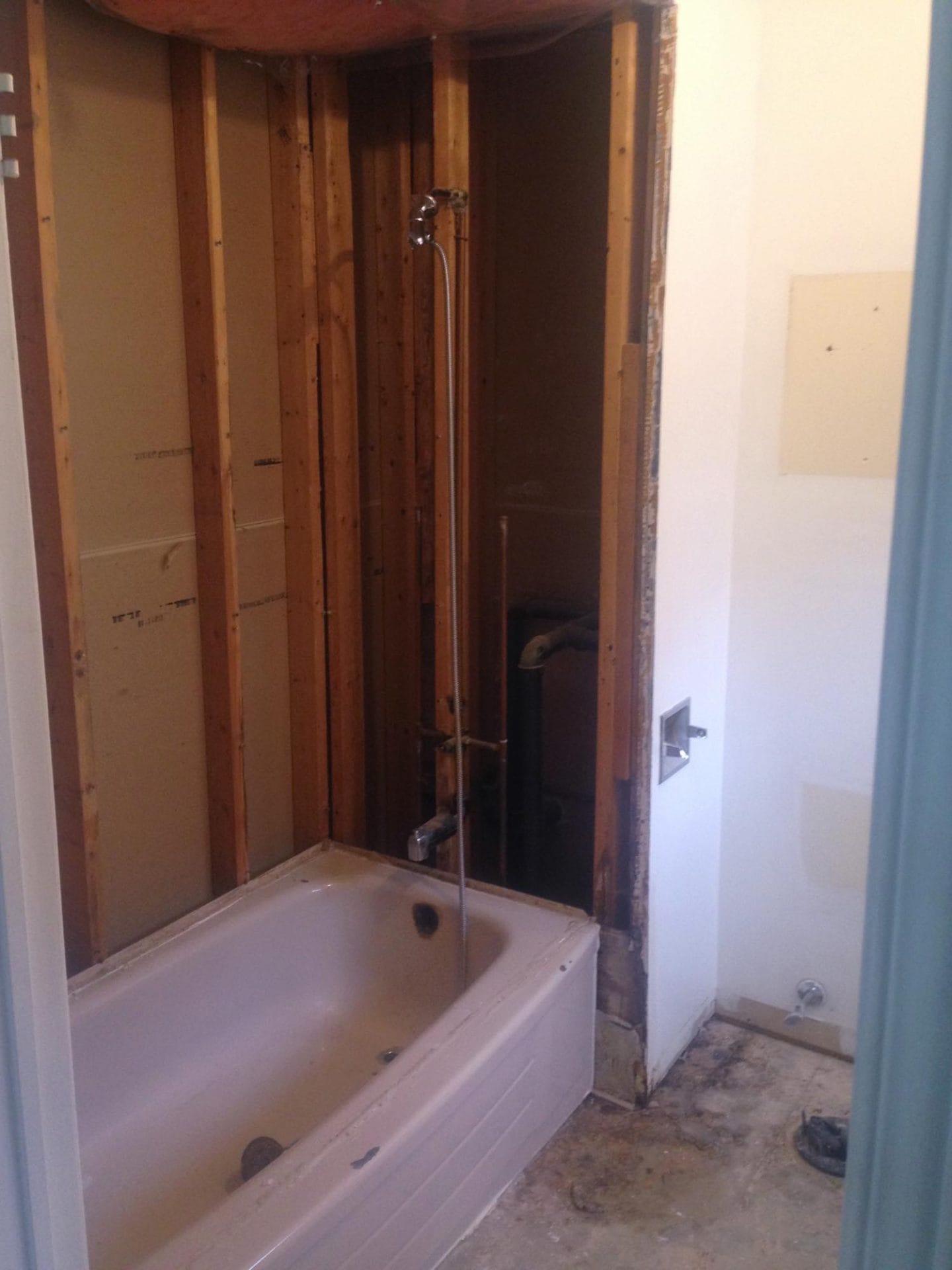 Full bedroom to master bath conversion , new drainage/venting and water supply lines, 24″ x 24″ porcelain Carrera marble tile, Bright white flat white porcelain wall tile with pebble stone accent strip, new dual flush toilet, solid wood 60″ double vanity with quarz countertop and single arm faucets, 60″ soaker tub and hardware