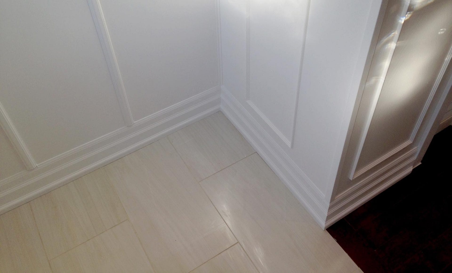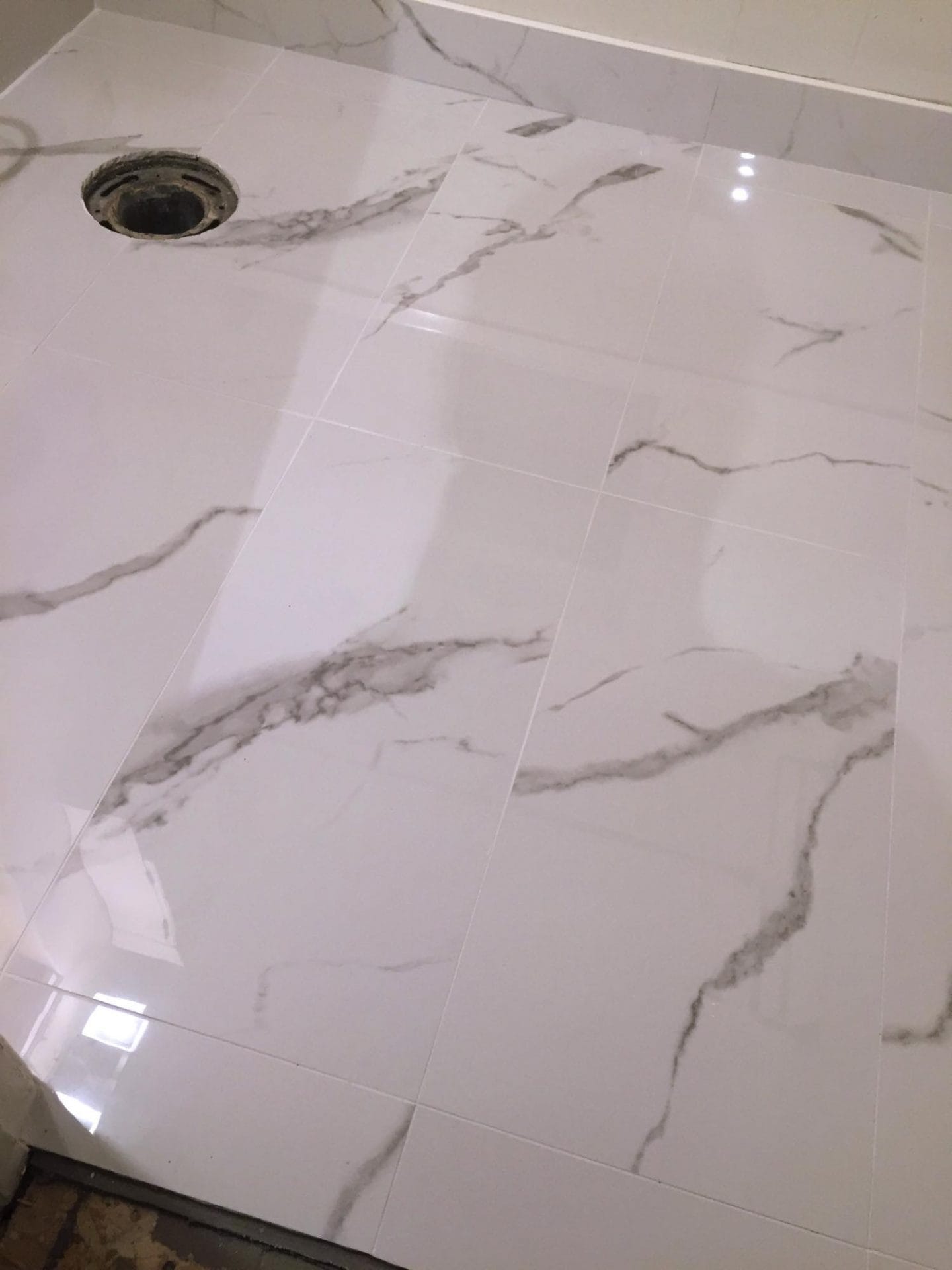 Full bedroom to master bath conversion , new drainage/venting and water supply lines, 24″ x 24″ porcelain Carrera marble tile, Bright white flat white porcelain wall tile with pebble stone accent strip, new dual flush toilet, solid wood 60″ double vanity with quartz countertop and single arm faucets, 60″ soaker tub and hardware