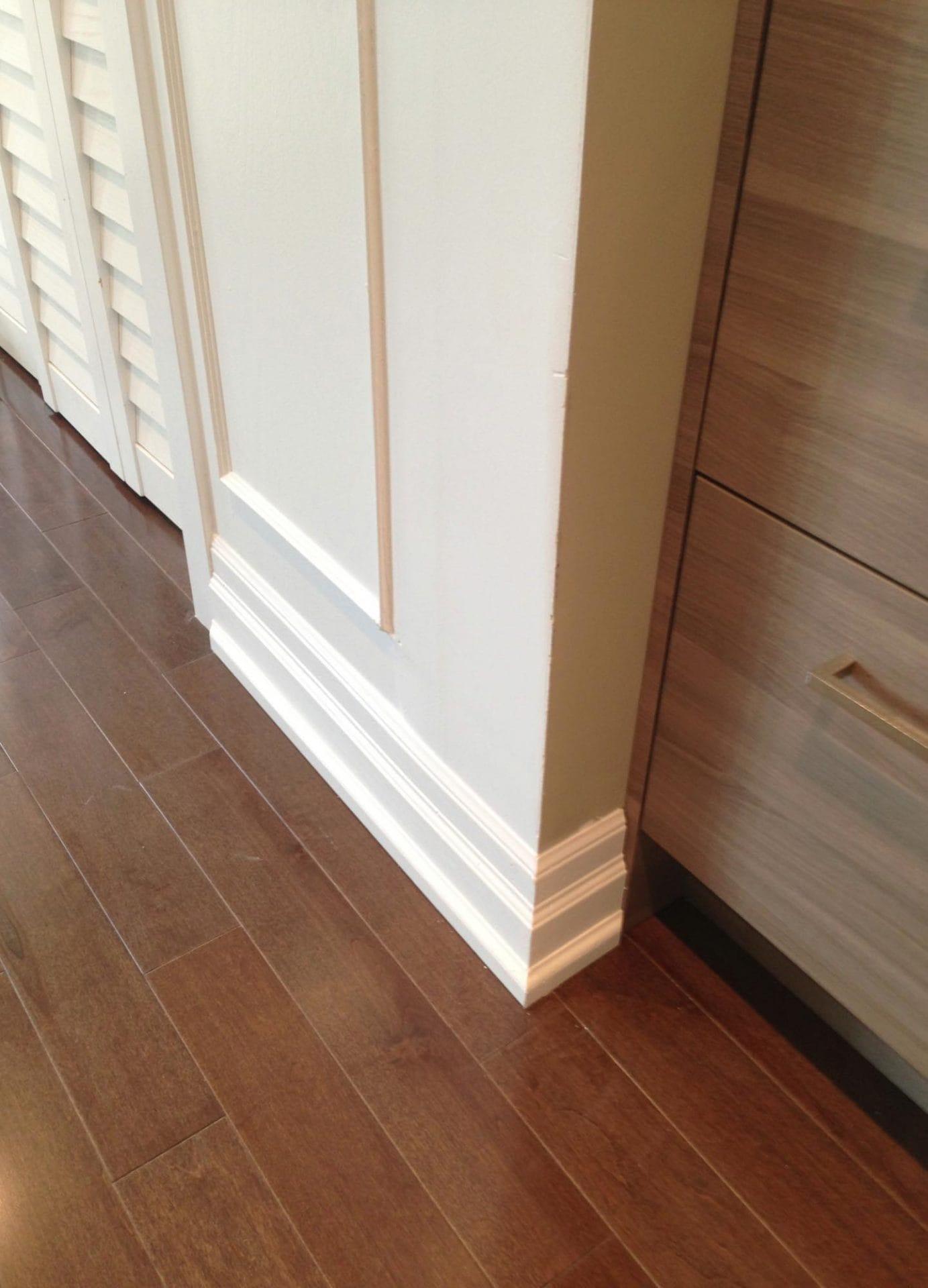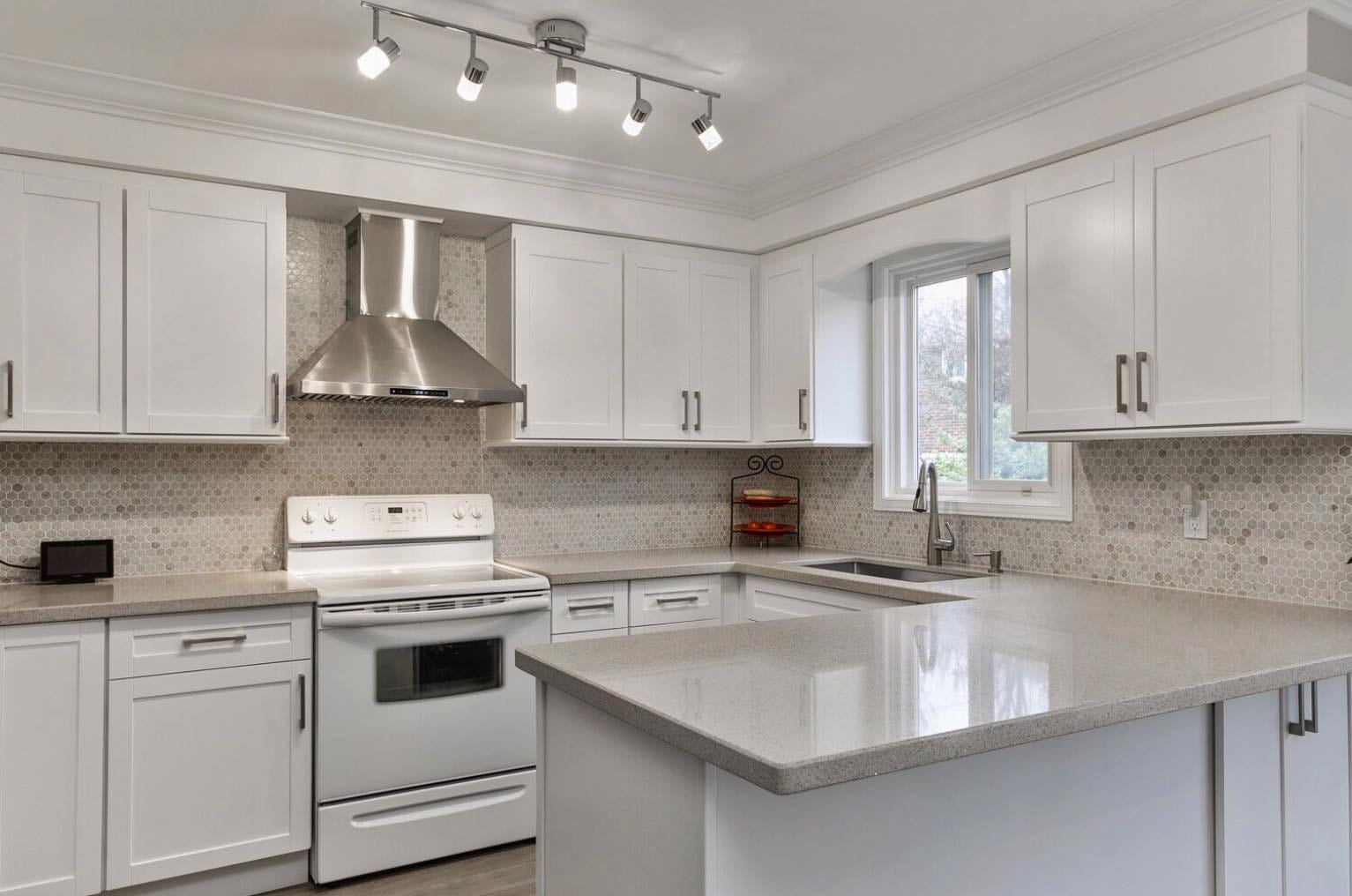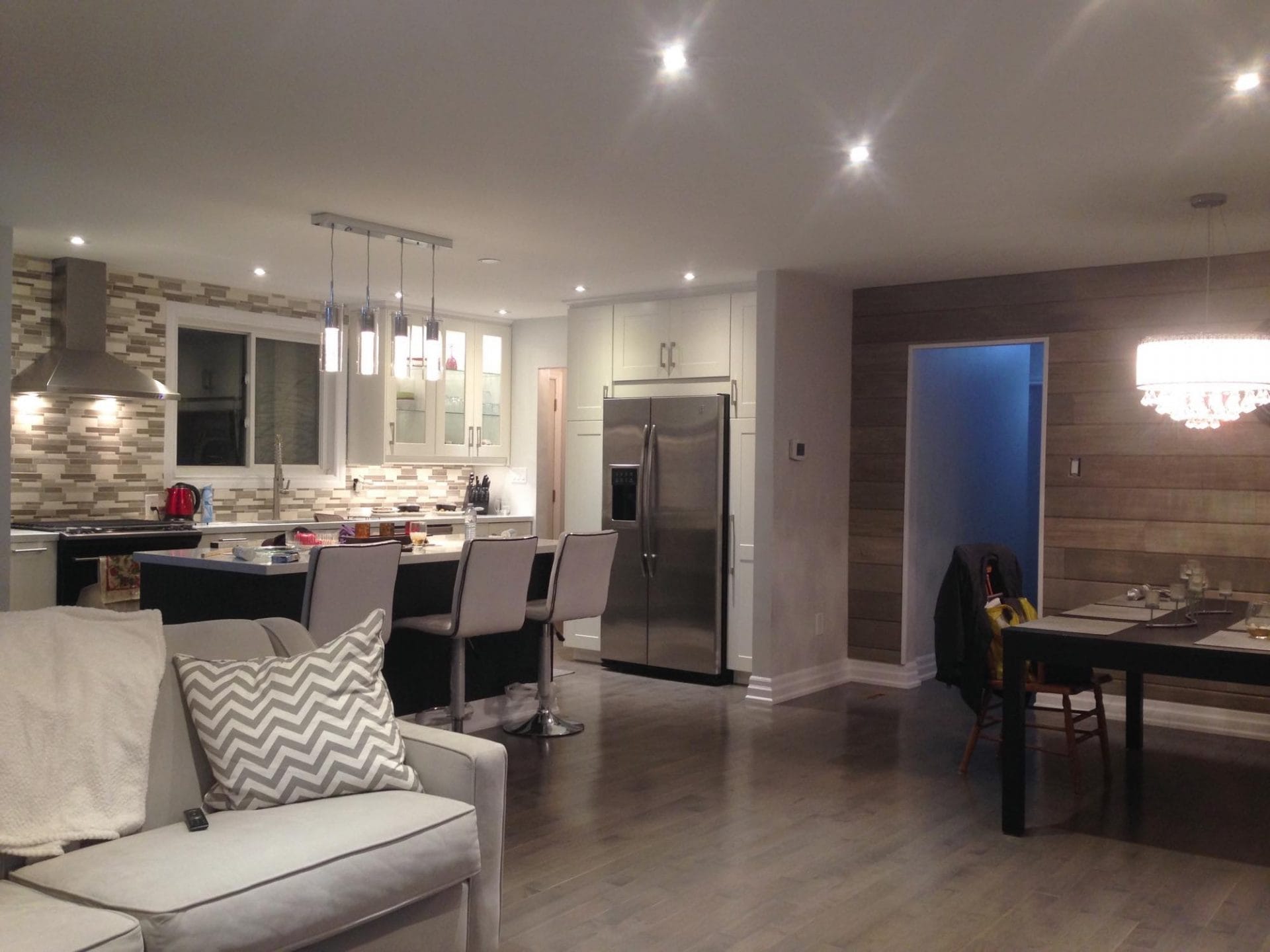 wall removal, new ceiling install with recessed lighting, new shaker style kitchen cabinets, quartz counter top, pendant lighting, maple flooring, dual step baseboards with matching shoe moulding,