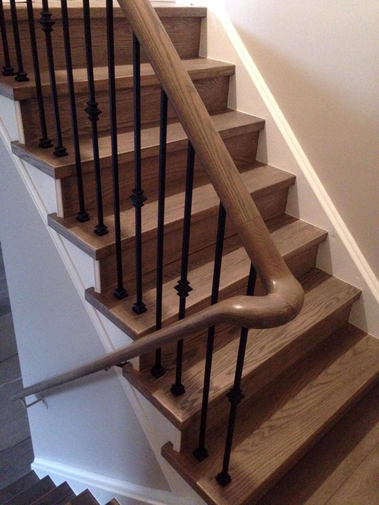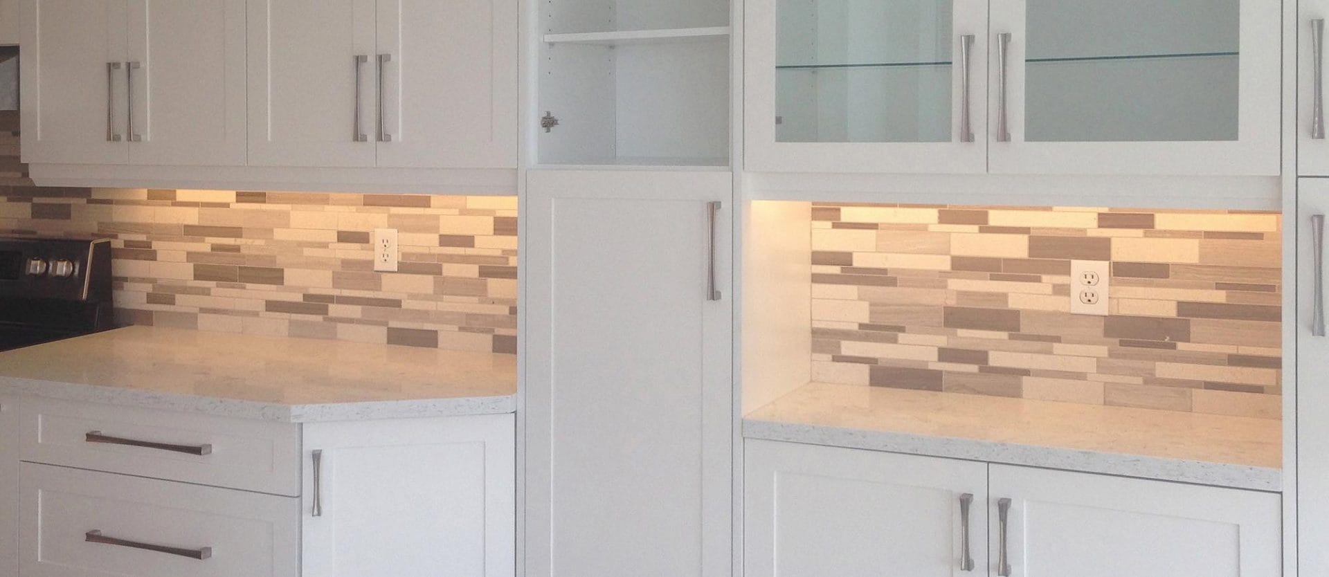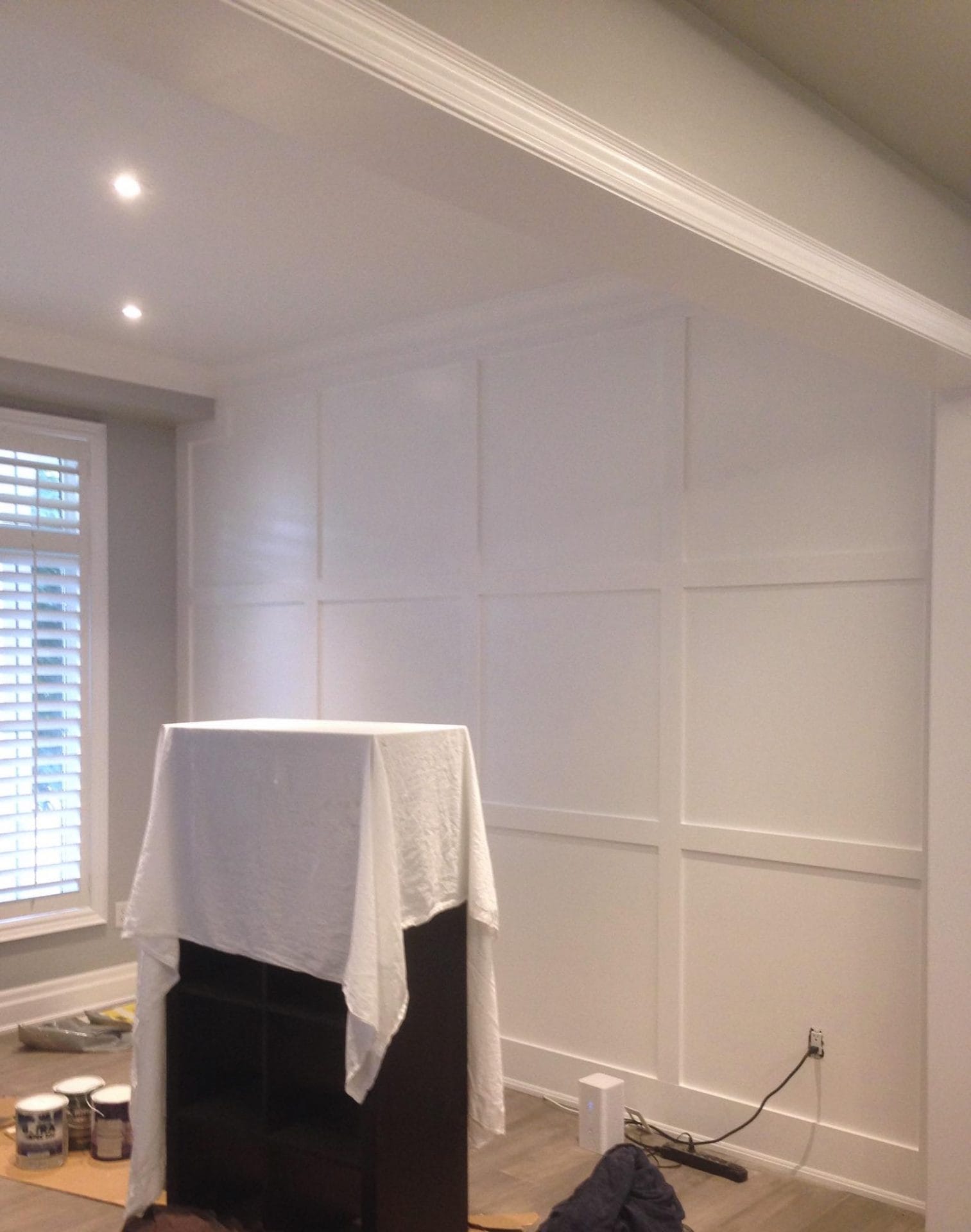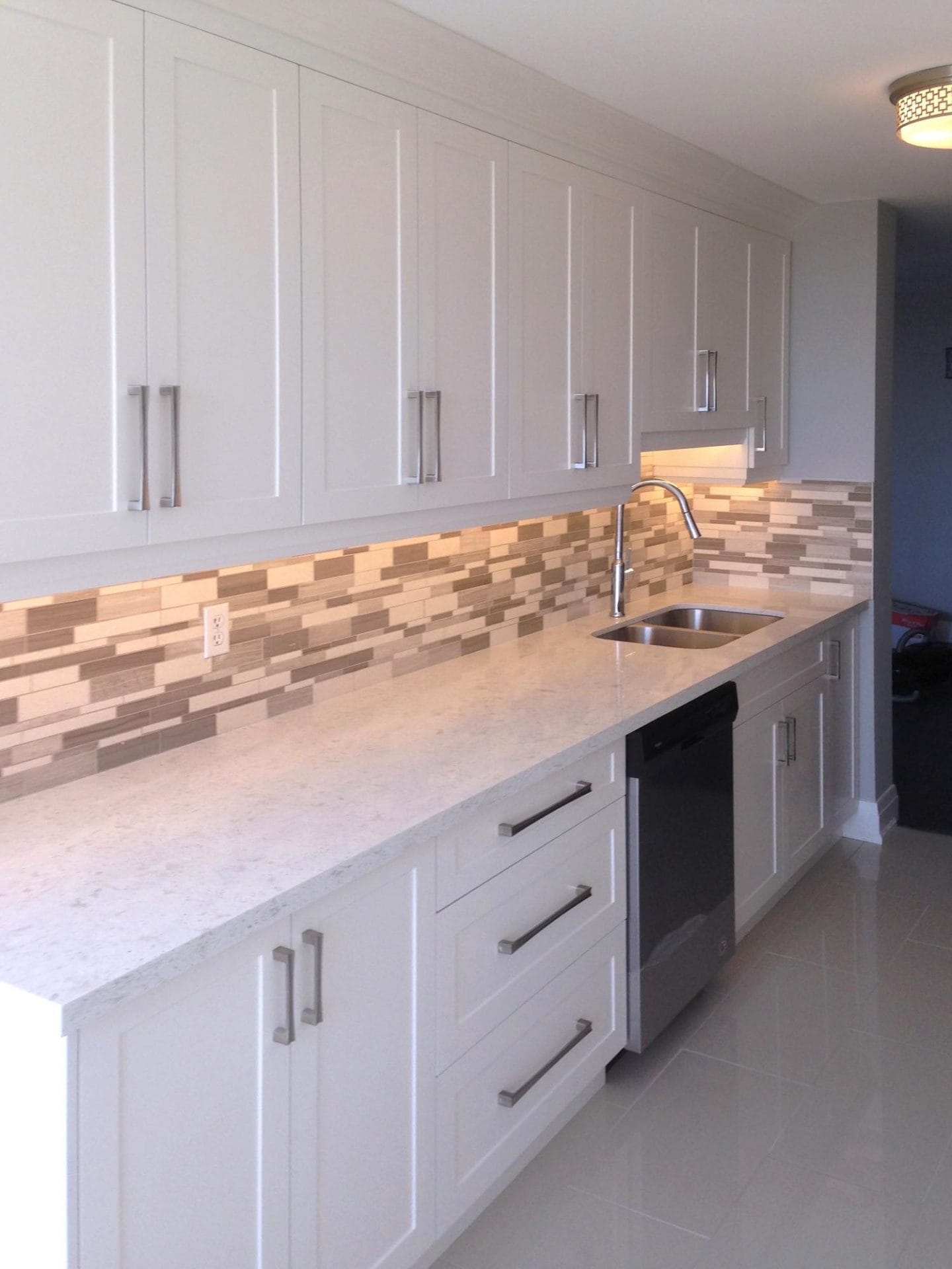 wall removal, new ceiling install with recessed lighting, new shaker style kitchen cabinets, quartz counter top, pendant lighting, maple flooring, dual step baseboards with matching shoe moulding,