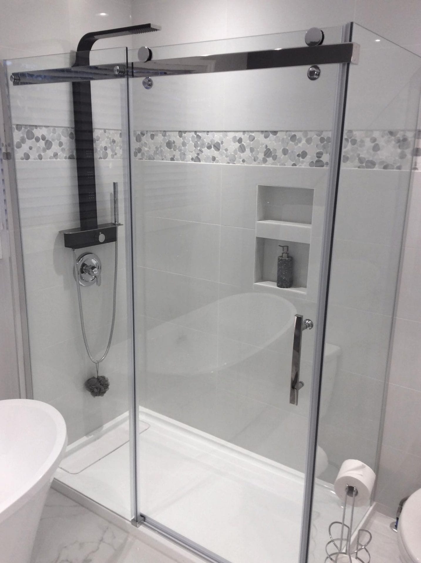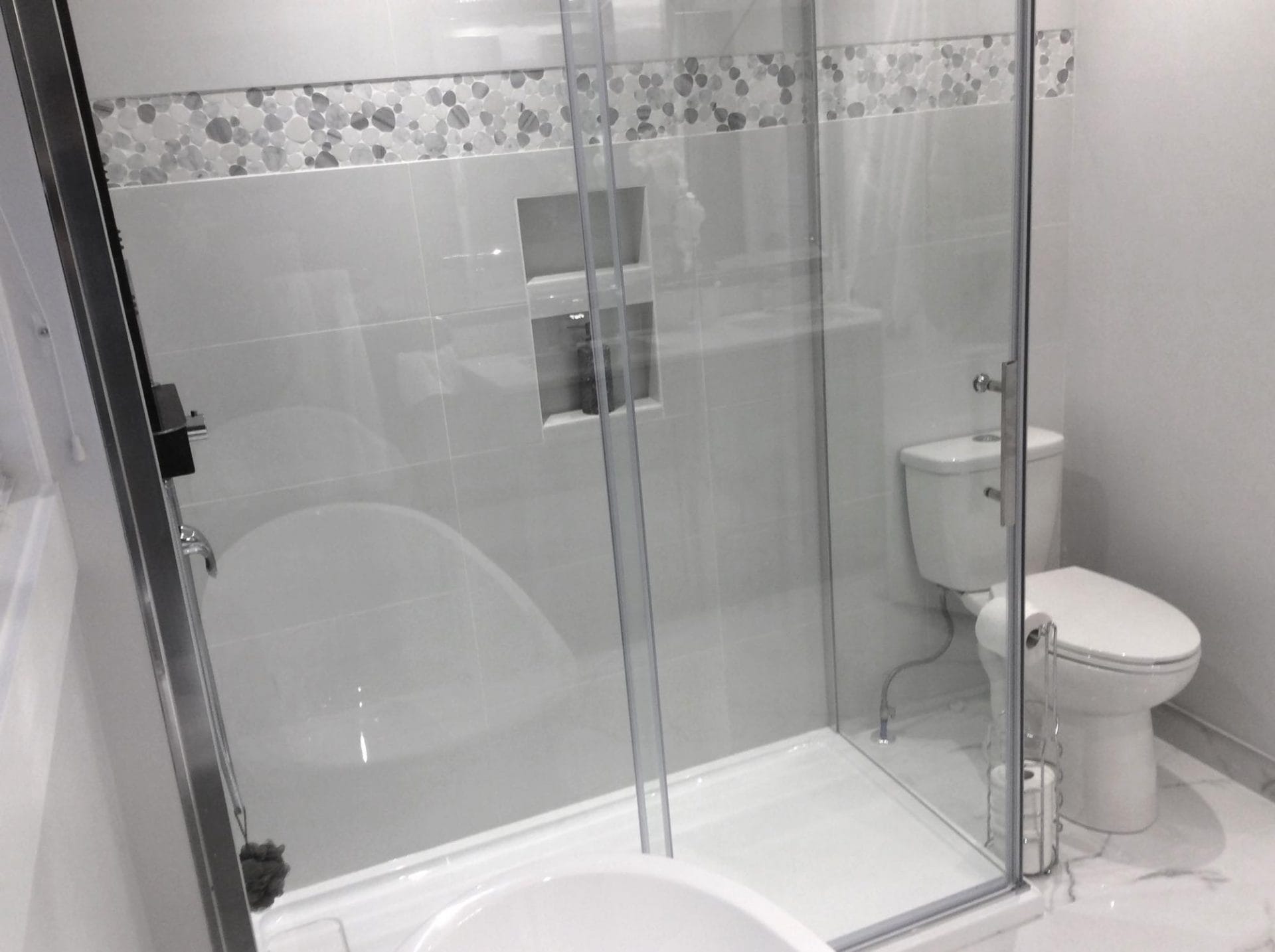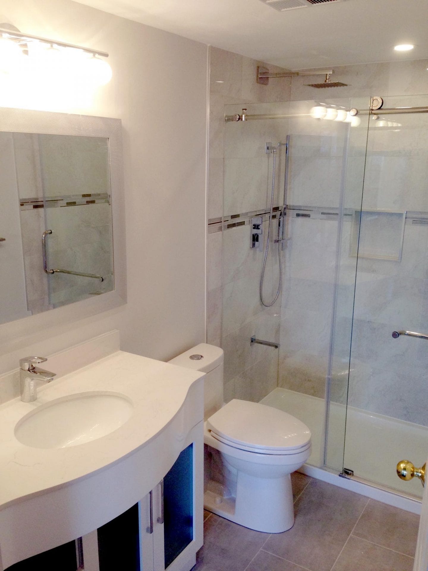 Complete bathroom remodel including; tub to shower conversion, glass door install, ceramic tile installation, white vanity with tumbled marble top and single lever faucet, adjustable shower spray head, in-wall shower shelf, porcelain shower wall tile with glass mosaic accent strip.
