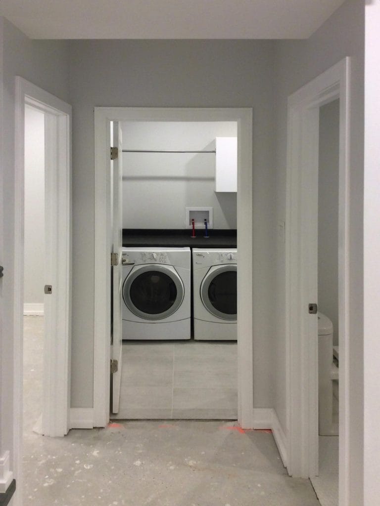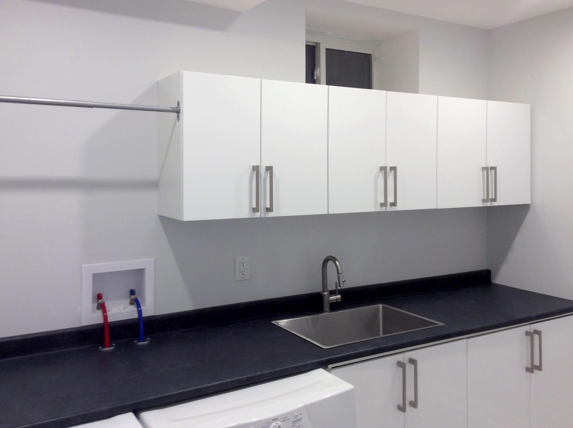 Full custom laundry build including; flat slab cabinets with hang rack, linoleum counter top, ss oversized laundry tub, brushed single arm faucet, water line shutt off box and hidden drain, 1'x2' ceramic tile with 6 inch single step baseboard