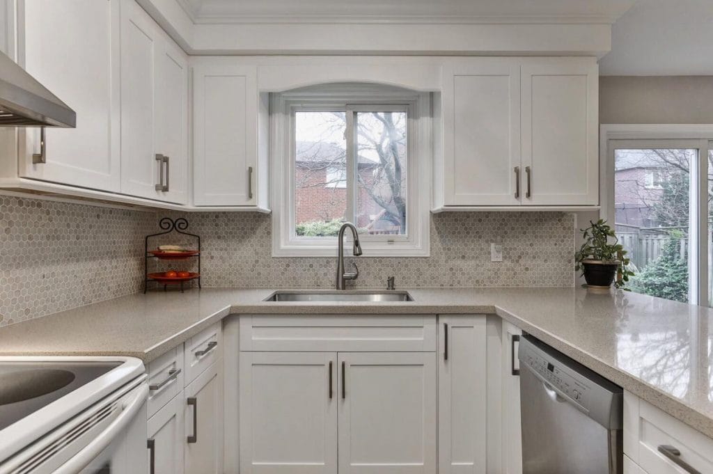 New shaker style solid oak cabinets with a beige quartz countertop, under mount square sink, new crown moulding and penny style ceramic backsplash