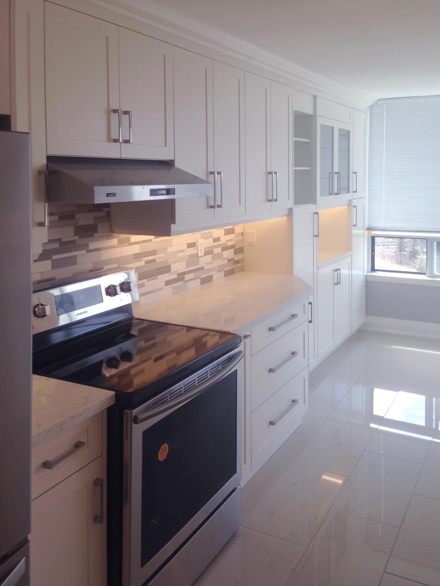 New shaker style solid oak cabinets with a beige quartz countertop, under mount square sink, new crown moulding and penny style ceramic backsplash